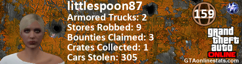 [URL=http://GTAonlinestats.com/showplayer/littlespoon87][IMG]http://GTAonlinestats.com/crimesignature/littlespoon87/sig.png[/IMG][/URL]