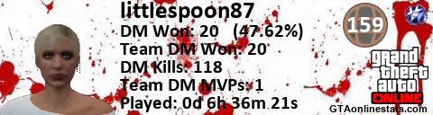[URL=http://GTAonlinestats.com/showplayer/littlespoon87][IMG]http://GTAonlinestats.com/dmsignature/littlespoon87/sig.png[/IMG][/URL]