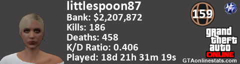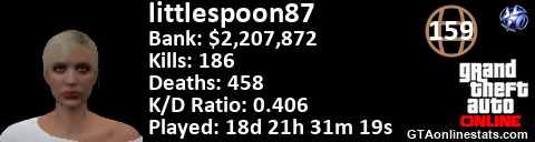 [URL=http://GTAonlinestats.com/showplayer/littlespoon87][IMG]http://GTAonlinestats.com/signature/littlespoon87/sig.png[/IMG][/URL]