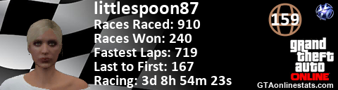 <a href="http://GTAonlinestats.com/showplayer/littlespoon87"><img src="http://GTAonlinestats.com/racesignature/littlespoon87/sig.png" alt="littlespoon87" border="0" /></a>