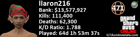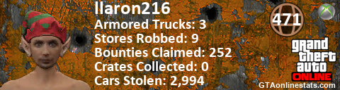 <a href="http://GTAonlinestats.com/showplayer/llaron216"><img src="http://GTAonlinestats.com/randomsignature/llaron216/sig.png" alt="llaron216" border="0" /></a>