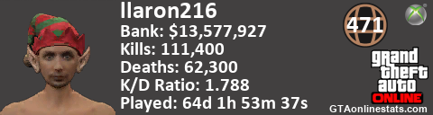 [URL=http://GTAonlinestats.com/showplayer/llaron216][IMG]http://GTAonlinestats.com/signature/llaron216/sig.png[/IMG][/URL]