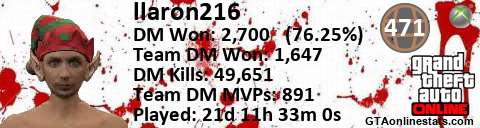 [URL=http://GTAonlinestats.com/showplayer/llaron216][IMG]http://GTAonlinestats.com/dmsignature/llaron216/sig.png[/IMG][/URL]