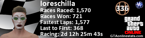 [URL=http://GTAonlinestats.com/showplayer/loreschilla][IMG]http://GTAonlinestats.com/racesignature/loreschilla/sig.png[/IMG][/URL]
