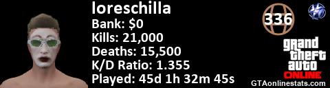 [URL=http://GTAonlinestats.com/showplayer/loreschilla][IMG]http://GTAonlinestats.com/signature/loreschilla/sig.png[/IMG][/URL]