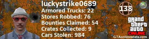 [URL=http://GTAonlinestats.com/showplayer/luckystrike0689][IMG]http://GTAonlinestats.com/signature/luckystrike0689/sig.png[/IMG][/URL]