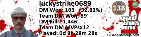 [URL=http://GTAonlinestats.com/showplayer/luckystrike0689][IMG]http://GTAonlinestats.com/dmsignature/luckystrike0689/sig.png[/IMG][/URL]