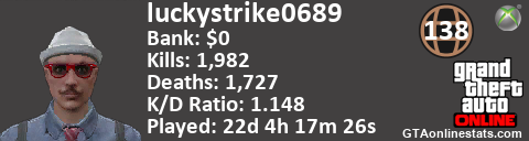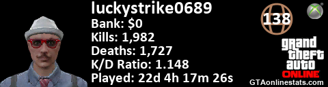 <a href="http://GTAonlinestats.com/showplayer/luckystrike0689"><img src="http://GTAonlinestats.com/signature/luckystrike0689/sig.png" alt="luckystrike0689" border="0" /></a>