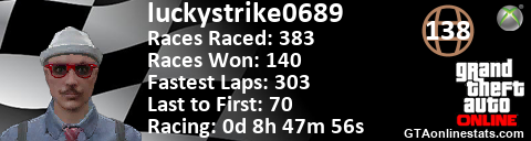 <a href="http://GTAonlinestats.com/showplayer/luckystrike0689"><img src="http://GTAonlinestats.com/racesignature/luckystrike0689/sig.png" alt="luckystrike0689" border="0" /></a>