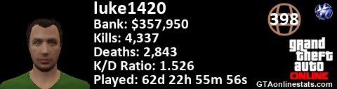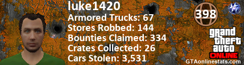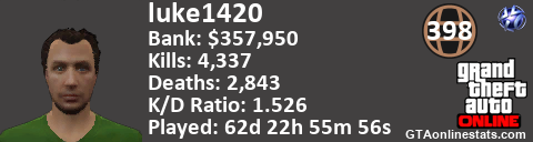 [URL=http://GTAonlinestats.com/showplayer/luke1420][IMG]http://GTAonlinestats.com/signature/luke1420/sig.png[/IMG][/URL]