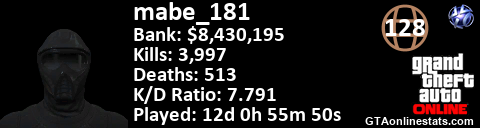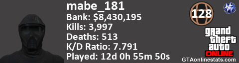 <a href="http://GTAonlinestats.com/showplayer/mabe_181"><img src="http://GTAonlinestats.com/dmsignature/mabe_181/sig.png" alt="mabe_181" border="0" /></a>