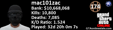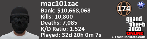 <a href="http://GTAonlinestats.com/showplayer/mac101zac"><img src="http://GTAonlinestats.com/signature/mac101zac/sig.png" alt="mac101zac" border="0" /></a>
