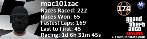 <a href="http://GTAonlinestats.com/showplayer/mac101zac"><img src="http://GTAonlinestats.com/racesignature/mac101zac/sig.png" alt="mac101zac" border="0" /></a>