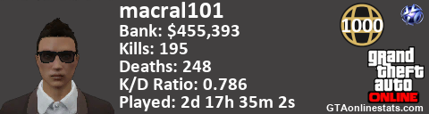 <a href="http://GTAonlinestats.com/showplayer/macral101"><img src="http://GTAonlinestats.com/signature/macral101/sig.png" alt="macral101" border="0" /></a>