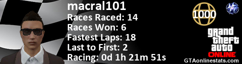 [URL=http://GTAonlinestats.com/showplayer/macral101][IMG]http://GTAonlinestats.com/racesignature/macral101/sig.png[/IMG][/URL]
