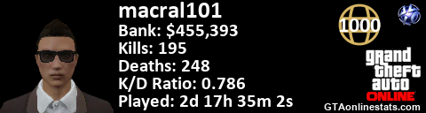 <a href="http://GTAonlinestats.com/showplayer/macral101"><img src="http://GTAonlinestats.com/randomsignature/macral101/sig.png" alt="macral101" border="0" /></a>