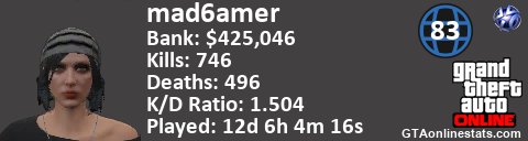 <a href="http://GTAonlinestats.com/showplayer/mad6amer"><img src="http://GTAonlinestats.com/signature/mad6amer/sig.png" alt="mad6amer" border="0" /></a>