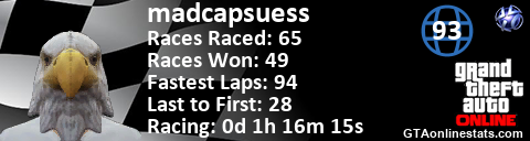 [URL=http://GTAonlinestats.com/showplayer/madcapsuess][IMG]http://GTAonlinestats.com/racesignature/madcapsuess/sig.png[/IMG][/URL]