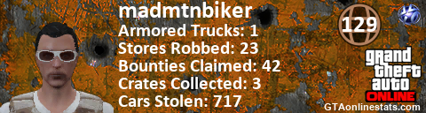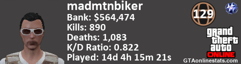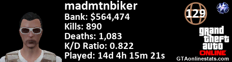 <a href="http://GTAonlinestats.com/showplayer/madmtnbiker"><img src="http://GTAonlinestats.com/signature/madmtnbiker/sig.png" alt="madmtnbiker" border="0" /></a>