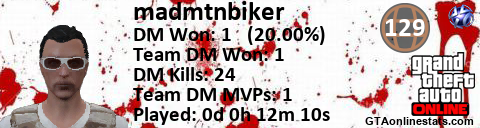 [URL=http://GTAonlinestats.com/showplayer/madmtnbiker][IMG]http://GTAonlinestats.com/dmsignature/madmtnbiker/sig.png[/IMG][/URL]