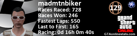 [URL=http://GTAonlinestats.com/showplayer/madmtnbiker][IMG]http://GTAonlinestats.com/racesignature/madmtnbiker/sig.png[/IMG][/URL]