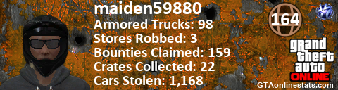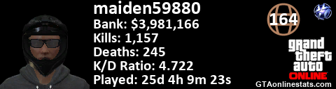 [URL=http://GTAonlinestats.com/showplayer/maiden59880][IMG]http://GTAonlinestats.com/signature/maiden59880/sig.png[/IMG][/URL]