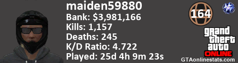 [URL=http://GTAonlinestats.com/showplayer/maiden59880][IMG]http://GTAonlinestats.com/dmsignature/maiden59880/sig.png[/IMG][/URL]