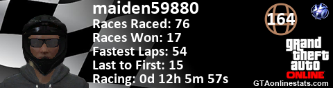 <a href="http://GTAonlinestats.com/showplayer/maiden59880"><img src="http://GTAonlinestats.com/racesignature/maiden59880/sig.png" alt="maiden59880" border="0" /></a>