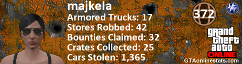 [URL=http://GTAonlinestats.com/showplayer/majkela][IMG]http://GTAonlinestats.com/crimesignature/majkela/sig.png[/IMG][/URL]