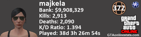 <a href="http://GTAonlinestats.com/showplayer/majkela"><img src="http://GTAonlinestats.com/dmsignature/majkela/sig.png" alt="Majkela" border="0" /></a>