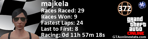 <a href="http://GTAonlinestats.com/showplayer/majkela"><img src="http://GTAonlinestats.com/racesignature/majkela/sig.png" alt="Majkela" border="0" /></a>