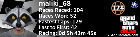 <a href="http://GTAonlinestats.com/showplayer/maliki_68"><img src="http://GTAonlinestats.com/racesignature/maliki_68/sig.png" alt="Maliki_68" border="0" /></a>