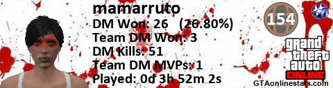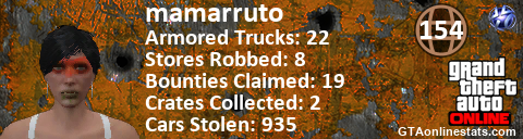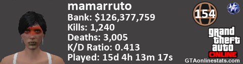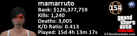 <a href="http://GTAonlinestats.com/showplayer/mamarruto"><img src="http://GTAonlinestats.com/randomsignature/mamarruto/sig.png" alt="mamarruto" border="0" /></a>