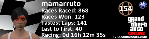 [URL=http://GTAonlinestats.com/showplayer/mamarruto][IMG]http://GTAonlinestats.com/racesignature/mamarruto/sig.png[/IMG][/URL]
