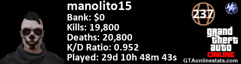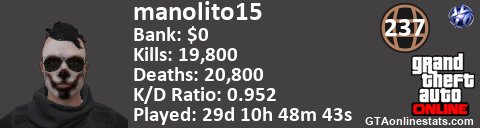 [URL=http://GTAonlinestats.com/showplayer/manolito15][IMG]http://GTAonlinestats.com/signature/manolito15/sig.png[/IMG][/URL]