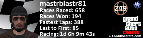 <a href="http://GTAonlinestats.com/showplayer/mastrblastr81"><img src="http://GTAonlinestats.com/racesignature/mastrblastr81/sig.png" alt="MastrBlastr81" border="0" /></a>