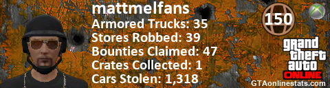 [URL=http://GTAonlinestats.com/showplayer/mattmelfans][IMG]http://GTAonlinestats.com/randomsignature/mattmelfans/sig.png[/IMG][/URL]