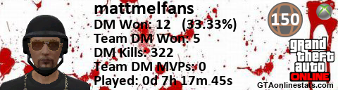 [URL=http://GTAonlinestats.com/showplayer/mattmelfans][IMG]http://GTAonlinestats.com/dmsignature/mattmelfans/sig.png[/IMG][/URL]