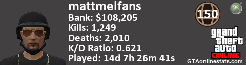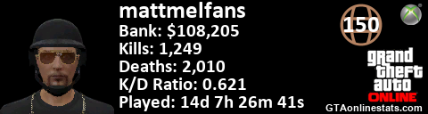 [URL=http://GTAonlinestats.com/showplayer/mattmelfans][IMG]http://GTAonlinestats.com/greysignature/mattmelfans/sig.png[/IMG][/URL]