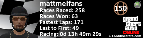 <a href="http://GTAonlinestats.com/showplayer/mattmelfans"><img src="http://GTAonlinestats.com/racesignature/mattmelfans/sig.png" alt="mattmelfans" border="0" /></a>