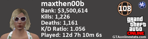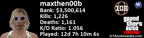<a href="http://GTAonlinestats.com/showplayer/maxthen00b"><img src="http://GTAonlinestats.com/signature/maxthen00b/sig.png" alt="MaxTheN00B" border="0" /></a>
