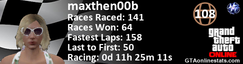 [URL=http://GTAonlinestats.com/showplayer/maxthen00b][IMG]http://GTAonlinestats.com/racesignature/maxthen00b/sig.png[/IMG][/URL]