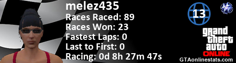 <a href="http://GTAonlinestats.com/showplayer/melez435/2"><img src="http://GTAonlinestats.com/racesignature/melez435/2/sig.png" alt="melez435" border="0" /></a>