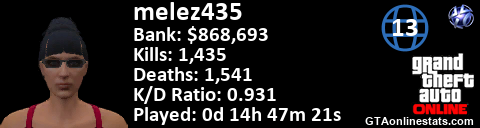 [URL=http://GTAonlinestats.com/showplayer/melez435/2][IMG]http://GTAonlinestats.com/signature/melez435/2/sig.png[/IMG][/URL]