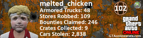 [URL=http://GTAonlinestats.com/showplayer/melted_chicken][IMG]http://GTAonlinestats.com/crimesignature/melted_chicken/sig.png[/IMG][/URL]