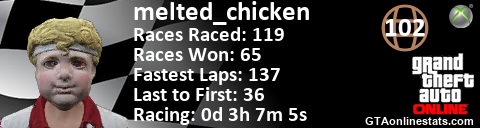 [URL=http://GTAonlinestats.com/showplayer/melted_chicken][IMG]http://GTAonlinestats.com/racesignature/melted_chicken/sig.png[/IMG][/URL]
