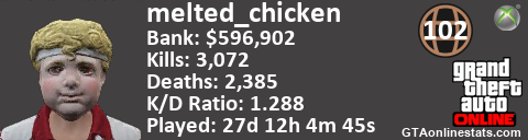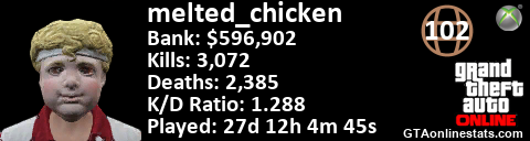 [URL=http://GTAonlinestats.com/showplayer/melted_chicken][IMG]http://GTAonlinestats.com/signature/melted_chicken/sig.png[/IMG][/URL]