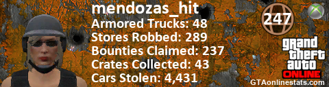 <a href="http://GTAonlinestats.com/showplayer/mendozas_hit"><img src="http://GTAonlinestats.com/crimesignature/mendozas_hit/sig.png" alt="mendozas_hit" border="0" /></a>