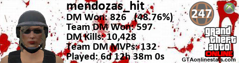 [URL=http://GTAonlinestats.com/showplayer/mendozas_hit][IMG]http://GTAonlinestats.com/dmsignature/mendozas_hit/sig.png[/IMG][/URL]