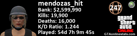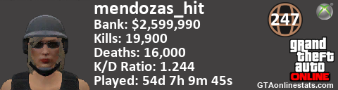 <a href="http://GTAonlinestats.com/showplayer/mendozas_hit"><img src="http://GTAonlinestats.com/dmsignature/mendozas_hit/sig.png" alt="mendozas_hit" border="0" /></a>
